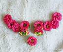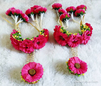 Designed with semi-circles of densely packed artificial flowers, the bracelets in this set wrap elegantly around the wrist. Additionally, several clusters of flowers hang down from the main floral arrangement, adding a dynamic and graceful element to the design. Multiple strands of delicate beads cascade from the floral arrangement, connecting to a prominent flower on the back of the hand, providing a dynamic and graceful design. The addition of ribbons for securing enhances their intricate floral craftsmanship and elegant beadwork.