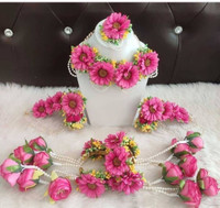 Featuring a beautifully coordinated necklace, maang tikka, earrings, and bracelets, this set is designed for traditional occasions such as weddings and engagements. It is ideal for girls and women, offering a harmonious blend of floral elements and beadwork that adds elegance to any ethnic attire.