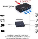 SINGLE INPUT TO MULTIPLE OUTPUTS: 1 HDMI INPUT SOURCE CAN BE SPLIT TO 4 HDMI OUTPUT DEVICES INDICATOR ON OR OFF WHEN THE INDICATOR LIGHT BECOMES GREEN, IT SHOWS THIS HDMI SPLITTER IS WORKING NOW TECHNICAL DETAILS: IT SUPPORTS 4K/2K 1080P AND 3D RESOLUTIONS, IT CAN REACH UP TO 3840X2160/30HZ COMPATIBILITY: BASICALLY THE VARIETY OF AUDIO AND VIDEO FORMAT ARE SUPPORTED 8/10/12 BIT DEEP COLOR AND DTS-HD/DOLBY-TRUEHD/DTS/DOLBY-AC3/DSD SPECIFICATION: * POWER: DC 5V, 20W (MAX) * WORKING TEMPERATURE: 0?-40? * STORAGE TEMPERATURE: -20?-85? * OPERATING HUMIDITY RANGE: 5%-90% RH (UNCOMPRESS) * VIDEO AMPLIFIER CIRCUIT BANDWIDTH: 2.5GBS/250MHZ * VIDEO SIGNAL INPUT: 0.5-1.0V P-P * DISPLAY DATA CHANNEL SIGNAL INPUT: 5V P-P?TTL? * MAXIMUM SINGLE LINK RANGE: 1920*1440?1080P 1920 X 1200 - 1080P * SUPPORT VGA VIDEO FORMAT: 640*480?800*600?1024*768?1280*1024?1600*1280?1920*1440 * SUPPORT DTV/HDTV VIDEO FORMAT: 480I/576I/480P/576P/720P/1080I/1080P * VIDEO SIGNAL OUTPUT: HDMI 1.3B+HDCP1.0/1.1 * THE DISPLAY REFRESH RATE: 60HZ SPECIFICATION: 1. 1.65 GHZMHZ BANDWIDTH (3 DB) FULL LOAD 2. THE INPUT VIDEO SIGNAL LEVEL 1.2 VOLTS P - P 3. DDC INPUT SIGNAL LEVEL 5 VOLTS P - P (TTL) 4. SINGLE WAY CONNECTION SIGNAL RANGE 1080P/1920X1200 5. DATA TRANSFER RATE 2.25 GBITS X 3 AUDIO AND VIDEO SIGNAL INPUT: 1. SIGNAL TYPE: HDMI HD DIGITAL SIGNAL 2. INTERFACE: TYPE A 19 PIN FEMALE HEAD 3. DDWG DVI1.0 STANDARD 4. CONNECTOR TYPE: HDMI 19 PIN FEMALE HEAD 5. RECEIVE FROM 15M OR LESS (TO EXTEND, YOU CAN BUY HDMI SIGNAL EXTENDER) SIGNAL OUTPUT: 1. SIGNAL TYPE: HDMI HD DIGITAL SIGNAL 2. INTERFACE: TYPE A 19 PIN FEMALE HEAD * COLOR: BLACK * DIMENSION: 96*61*21MM * POWER CABLE LENGTH: APPROX. 90CM PACKAGE INCLUDES: 1 X 1 IN 4 OUT HDMI SPLITTER 1 X POWER ADAPTER 1 X USER MANUAL ?
