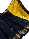 Crafted from soft cotton silk fabric, this saree combines comfort with visual appeal. The fabric drapes smoothly, providing a lightweight and breathable experience throughout the day. In addition, the cotton silk blend allows for gentle movement while maintaining this saree's shape, enhancing the wearing experience. Furthermore, the texture provides a subtle sheen that complements the woven motifs, contributing to this saree’s overall elegance.
