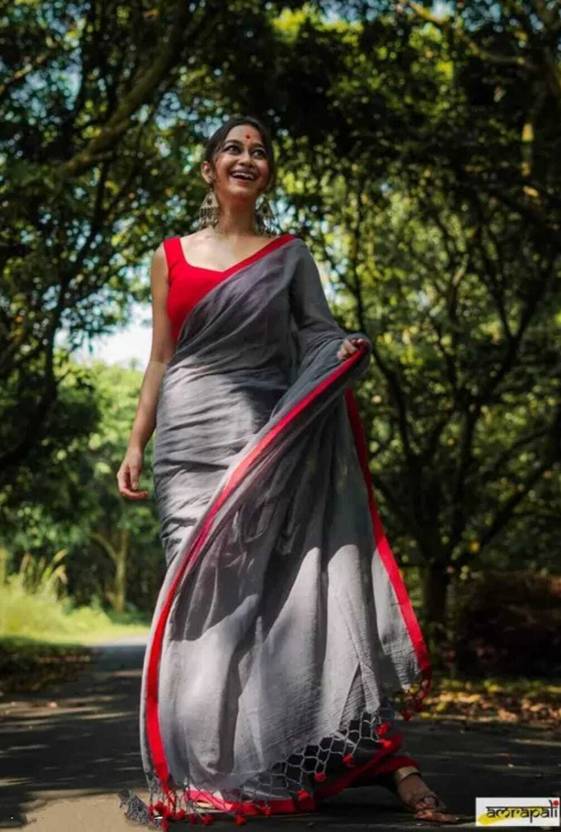 Abharani Saree Kuthir Solid/Plain Bollywood Cotton Blend Saree (Grey)