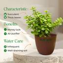 Bring home the timeless charm of the Jade Plant, also known as the "Money Plant", from Greenium – a beautiful indoor succulent believed to attract good luck, prosperity, and positive energy. Its thick, glossy, and fleshy leaves not only add a touch of natural elegance but also symbolize growth and wealth in Vastu and Feng Shui. This low-maintenance plant thrives best in bright, indirect sunlight and requires minimal watering, making it ideal for busy lifestyles, plant beginners, or office spaces. Whether you place it on your study desk, windowsill, or living room corner, it brings a refreshing burst of green and a calming vibe to any setting. Elevate your space with the beauty of this easy-care, air-purifying houseplant.