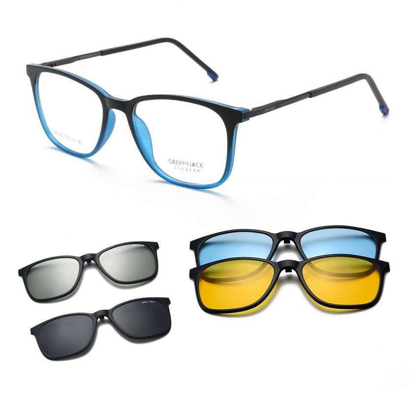 3D Polarized Clip On Glasses,Square TR90 Spectacle Frame with 4PCS Magnetic Lens for Myopia Men Women 6070 Black Blue Frame Black Leg