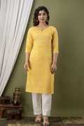 The straight style of the kurta elegantly frames the look. The straight style complements a range of body types. The straight style of the kurta has a traditional and subtle appeal which makes it an ideal option for different occasions. Additionally, the kurta has side slits, which add a playful flare to the look. The side slits maintain breathability and your range of motion. The side slits and straight style complement different styles of bottoms.