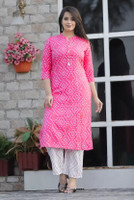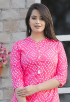 Giving the look a traditional touch, the kurta has a Bandhej print. The geometric arrangement of the Bandhej print gives the look a classic touch. The print tassle and stone detailing at the yoke give a striking element to the design. These elements go beautifully with each other for a beautiful look. You can pair the kurta for different occasion due to the elegant design.