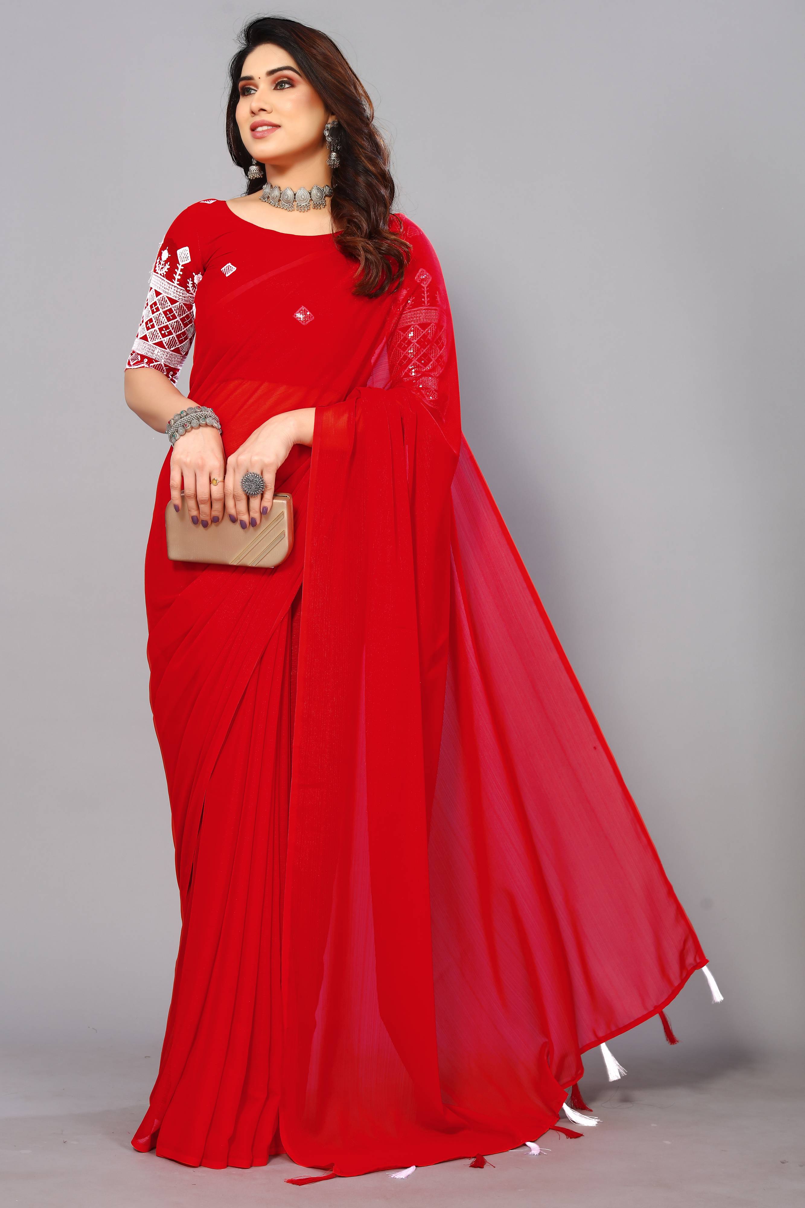 GRIFEZ Solid/Plain Bollywood Georgette Saree (Red)