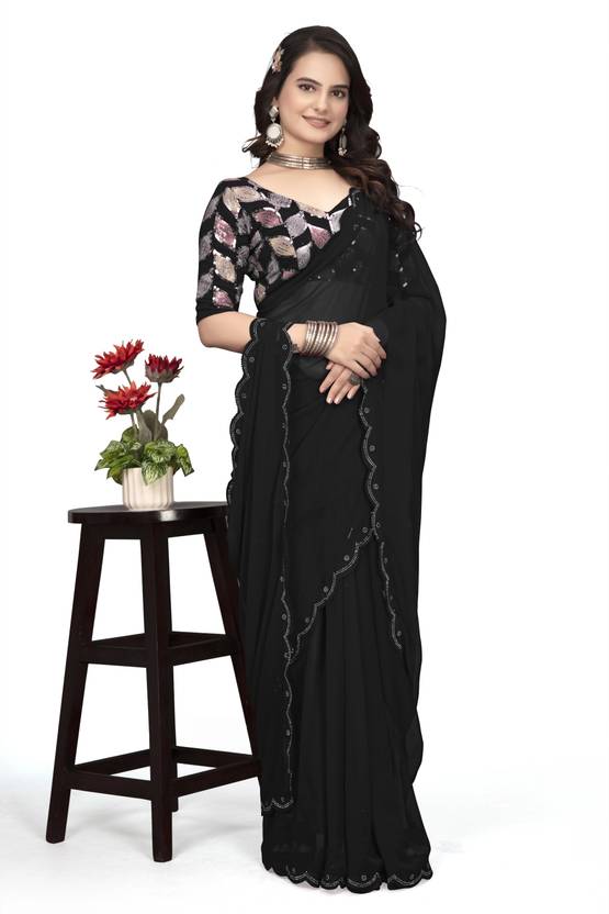 GRIFEZ Solid/Plain Bollywood Georgette Saree (Black)