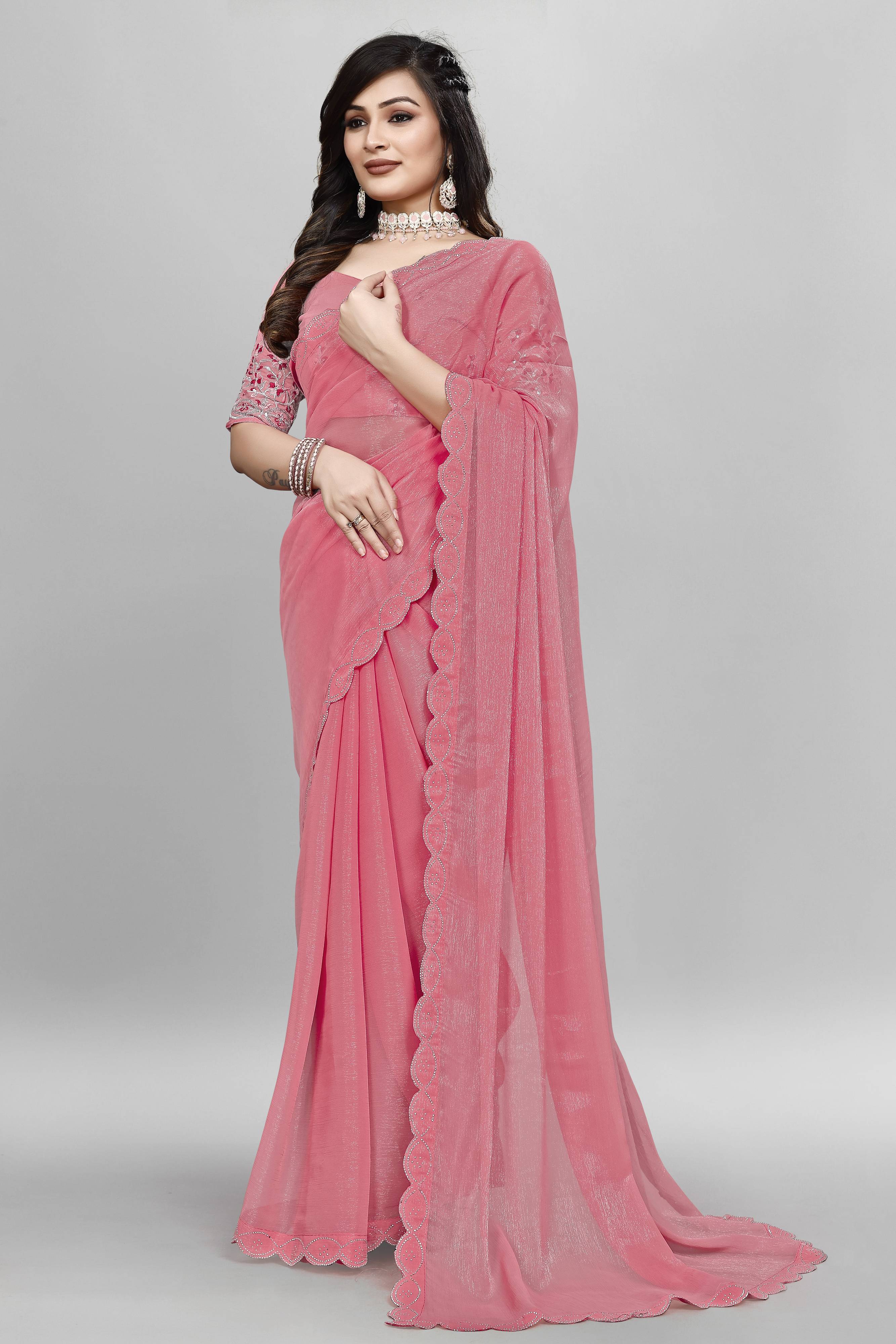 GRIFEZ Solid/Plain Bollywood Organza Saree (Pink)