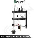 Crafted for lasting performance, our multipurpose shelf features a sturdy 2mm steel frame — twice the thickness of standard alternatives. The spacious first and second tiers offer ample storage, while the third tier showcases dual soap dishes, a tumbler holder, 4 brush holders, and convenient dual hooks on both ends for impeccable organization. Elevate your space with its functional style and robust storage capabilities.