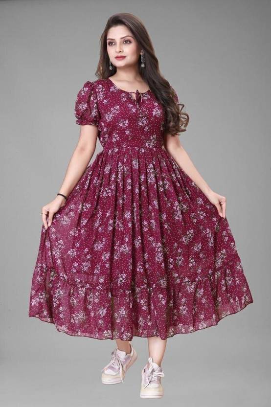 Fabric : Georgette, Pattern : Printed, This Dress Features A Stunning All-over Floral Print, Exuding A Touch Of Romance And Elegance, The Puff Sleeves Add A Playful And Trendy Element, While The Knee-length Design Strikes The Perfect Balance Between Sophistication And Comfort, Whether You're Attending A Garden Party Or A Casual Brunch, This Dress Is The Epitome Of Effortless Style, Printed Dress, Dress For Women, Party Wear Dress, Frock Women, Women Frock.