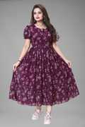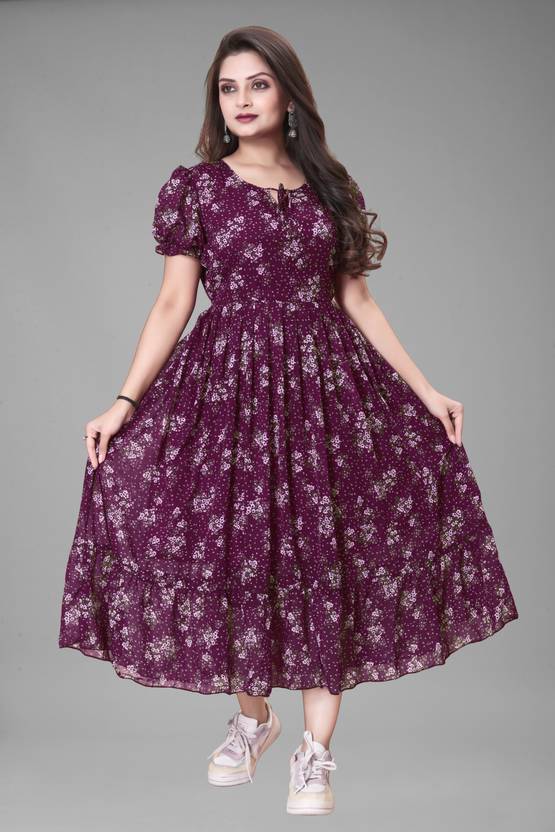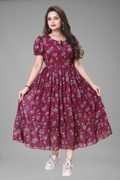 Fabric : Georgette, Pattern : Printed, This Dress Features A Stunning All-over Floral Print, Exuding A Touch Of Romance And Elegance, The Puff Sleeves Add A Playful And Trendy Element, While The Knee-length Design Strikes The Perfect Balance Between Sophistication And Comfort, Whether You're Attending A Garden Party Or A Casual Brunch, This Dress Is The Epitome Of Effortless Style, Printed Dress, Dress For Women, Party Wear Dress, Frock Women, Women Frock.