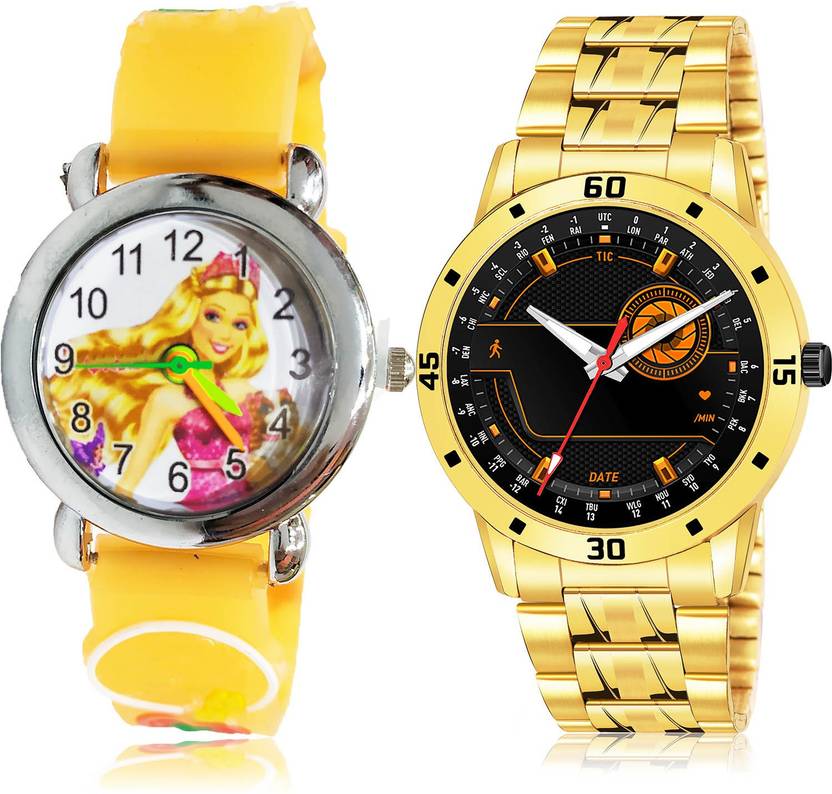 Dial Colour : White And Black ; Band Colour : Orange And Gold ; Case Shape : Round ; Band Material : Plastic And Stainless Steel ; Case Diameter : 29 And 43 mm ; GROOT Latest Heart Doll Kids And Gold Chain Orange And Gold Colour Analog Plastic And Stainless Steel Belt 2 Watch Combo For Boys And Men - BK24-(52-S-21)