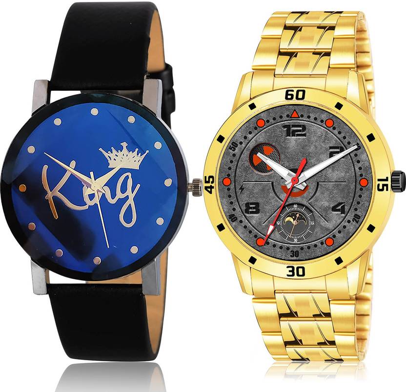 Dial Colour : Black And Grey ; Band Colour : Black And Gold ; Case Shape : Round ; Band Material : Genuine Leather And Stainless Steel ; Case Diameter : 39 And 43 mm ; GROOT Contemporary Formal King And Gold Chain Black And Gold Colour Analog Genuine Leather And Stainless Steel Belt 2 Watch Combo For Boys And Men - BC29-(13-S-21)
