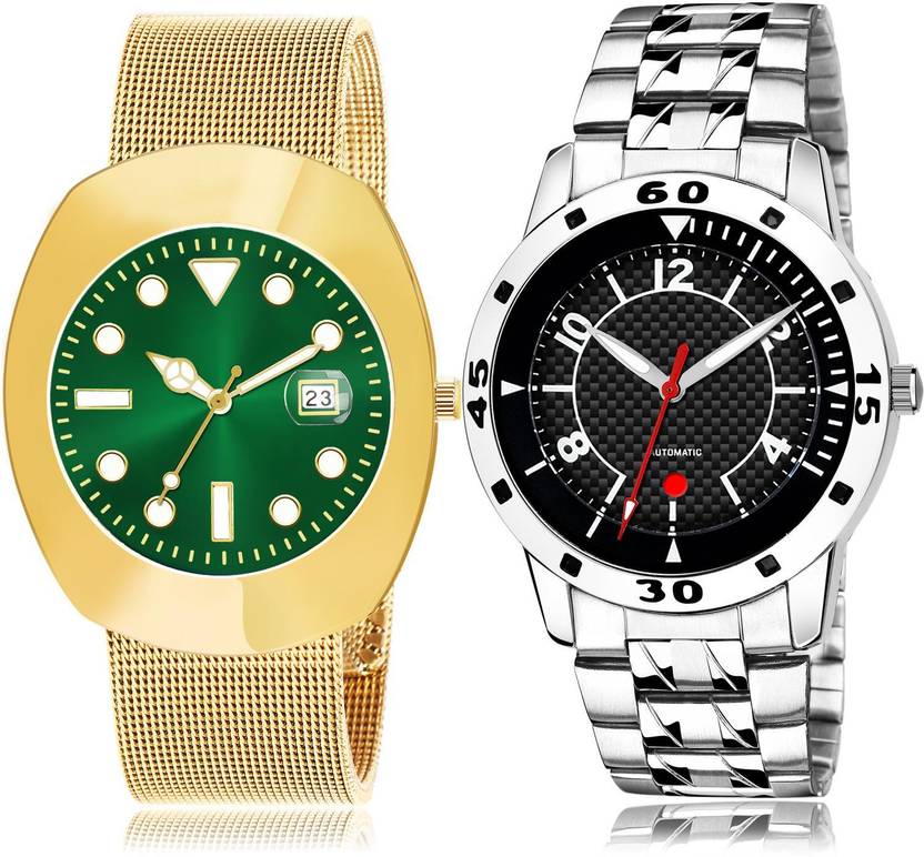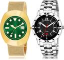Dial Colour : Green And Black ; Band Colour : Gold And Silver ; Case Shape : Oval And Round ; Band Material : Metal And Stainless Steel ; Case Diameter : 40 And 43 mm ; GROOT Latest Designer Day And Date Chain And Silver Chain Gold And Silver Colour Analog Metal And Stainless Steel Belt 2 Watch Combo For Boys And Men - BL46.140-(66-S-19)