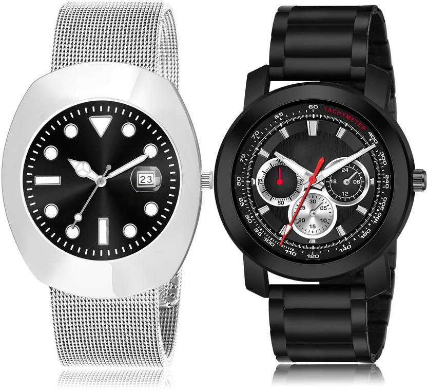 Dial Colour : Black ; Band Colour : Silver And Black ; Case Shape : Oval And Round ; Band Material : Metal And Stainless Steel ; Case Diameter : 40 And 47 mm ; GROOT Classical Quartz Day And Date Chain And Black Chain Silver And Black Colour Analog Metal And Stainless Steel Belt 2 Watch Combo For Boys And Men - BL46.141-(14-S-20)
