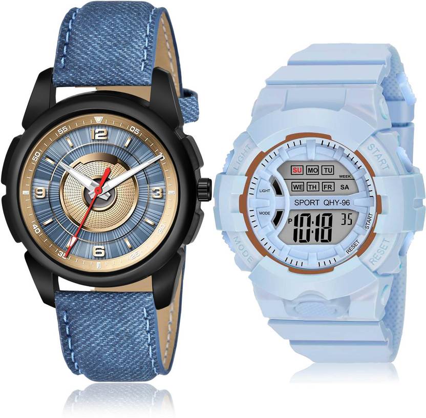 Dial Colour : Gold And White ; Band Colour : Blue ; Case Shape : Round ; Band Material : Genuine Leather And Plastic ; Case Diameter : 43 And 48 mm ; GROOT Best Quartz casual and digital kids watch Blue Colour Analog-Digital Genuine Leather And Plastic Belt 2 Watch Combo For Boys And Men - S317-DG34