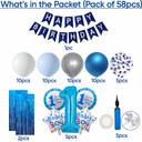 1pc Dark Blue Happy Birthday Banner, 5pcs.1st Birthday Boy celebration kit, 2pcs. of fringe foil curtain for decoration, 10pcs Silver Balloons, 10pcs White balloons, 10pc Blue Balloons, 10 pcs Blue Pastel Balloons, 5pcs. of blue confetti balloons, 2pcs Ribbon, 1pc of Glue Dot Tape, 1 pcs of Arch Roll & 1pc Hand Air Pump.
