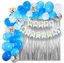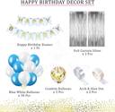 Package includes : 1x White Happy Birthday Banner ,2x silver Curtain, 15x white Balloon ,15xBlue Balloon,5x Gold Confittee And 1x Glue Dot And Arch