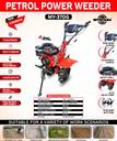 easy-to-handle weeder with Italian technology and design. The powerful petrol engine ensures efficiency, reduced vibration, and low noise which allows easy handling of the machine during step-land operations, it also has low emission levels and low maintenance. It is a multipurpose machine, Due to gear transmission and 20mn cr material of all gears, it does not have wear and tear and allows trouble-free and smooth functioning. It also has a PTO shaft for the sprayer, water pump, and Reaper application. This tiller can have many other implements attachments like a plough, ridger, potato digger, leveler, cultivator, trailer, etc. In the last few years, this weeder has become the favorite darling of Indian farmers across the country and can be easily rated as the best model that offers safe and comfortable operation. Powerful Petrol Engine Equipped with a robust petrol engine, this power weeder ensures exceptional efficiency and reduced vibration during operation. The low noise level allows for easy handling, particularly during step-land operations. With low emission levels and low maintenance requirements, this petrol engine offers reliable performance for a variety of agricultural tasks. Included Content Included with this power weeder is everything you need to get started right away. The adjustable handlebar provides comfort and control during operation, while the engine delivers reliable power. Rubber tyres ensure traction and stability, while the blade set, with up to 32 blades, offers versatile tilling options. Additional components, such as the blade housing rod, mudguard, air filter, bumper, and blade housing rod contribute to this weeder's durability and functionality. Lightweight and Efficient Designed for ease of use, this power weeder is lightweight and easy to manoeuvre. Its low noise operation and low fuel consumption contribute to a comfortable working environment, while its high efficiency ensures optimal performance with every use. Furthermore, with strong power and reliable operation, this weeder is ideal for tackling tough soil and vegetation with ease.