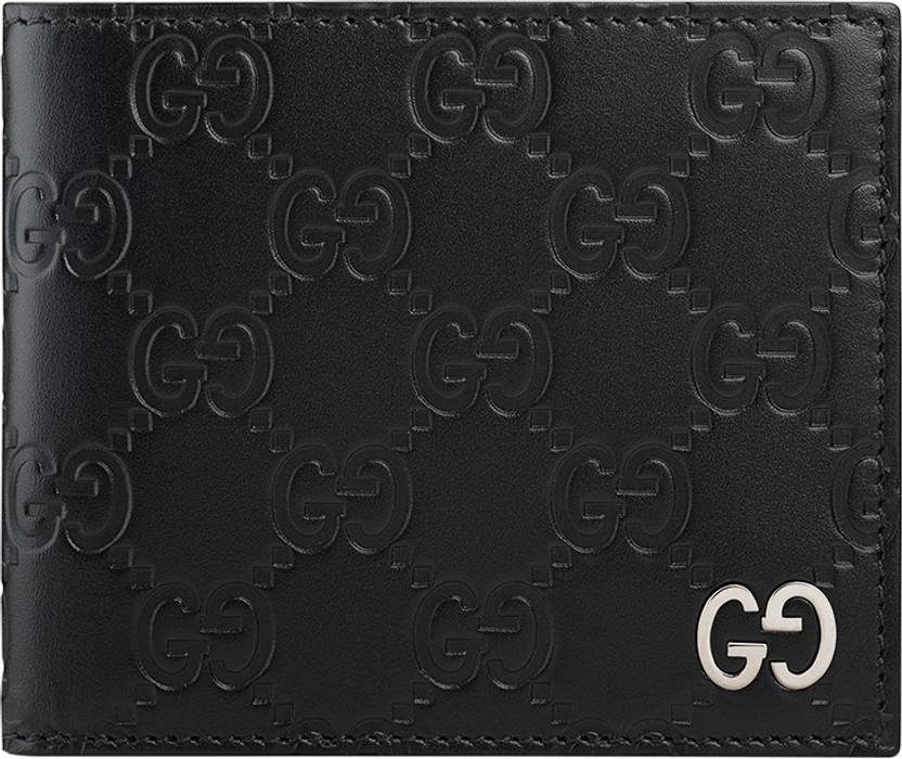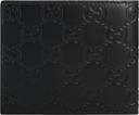 Gucci signature bi-fold men wallet. A bi-fold wallet made in heat debossed Gucci Signature leather with a defined print and firm texture. At the corner is a GG metal detail that reflects the Gucci Signature motif. Eight card slots and two bill compartments. Dimensions: Open: 8"W x 3.5"H Closed: 4.5"W x 3.5"H.