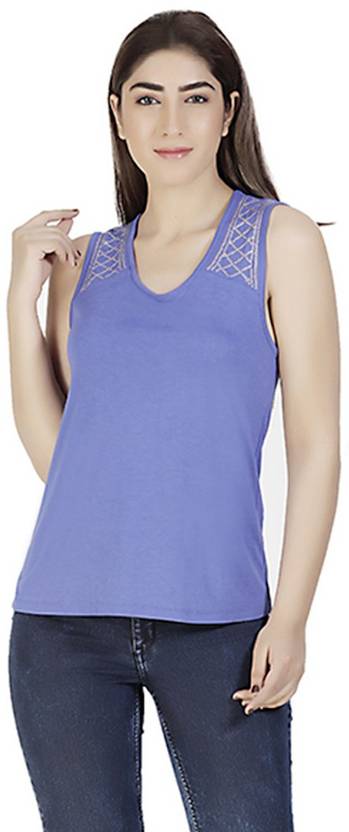 Enhance your beauty wearing this blue coloured tank top from Gudi. Made from Viscose jersey which is light in weight. Featuring a round neck, sleeveless & embellishment on yoke, this t-shirt can be teamed with jeans and county shoes to look stunning.