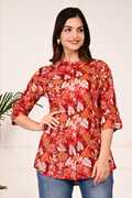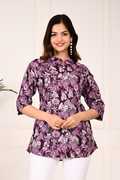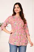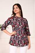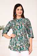 Top is like a shirt style, Buttons for closure, Mandarien Neck Stylish Design, Rayon Fabric to feel very impresive look, best suit with laggies, Jeans & Pants, Color and print quality is very fastness.