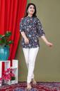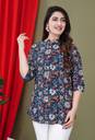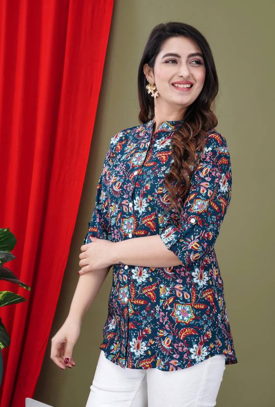 Top is like a shirt style, Buttons for closure, Manderian Neck Stylish Design, Rayon Fabric to feel very impresive look, best suit with laggies, Jeans & Pants, Color and print quality is very fastness.