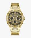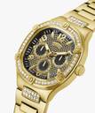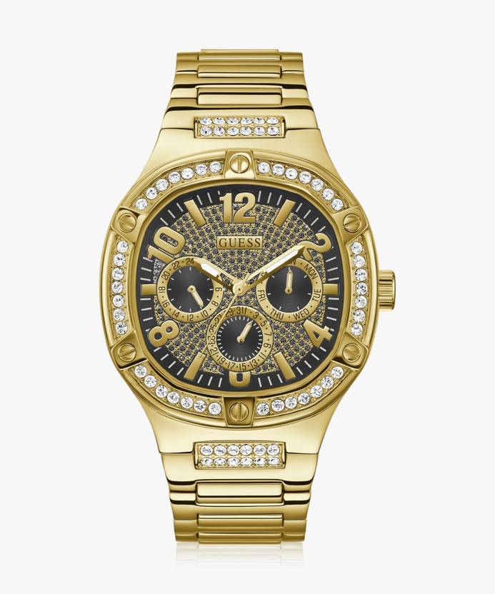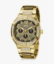 Guess Sport Duke Men 46.5mm Square Gold Tone Stainless Steel case with crystal, Multifunction watch with Black glitz dial and Gold Tone Stainless Steel Bracelet.