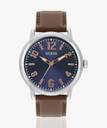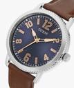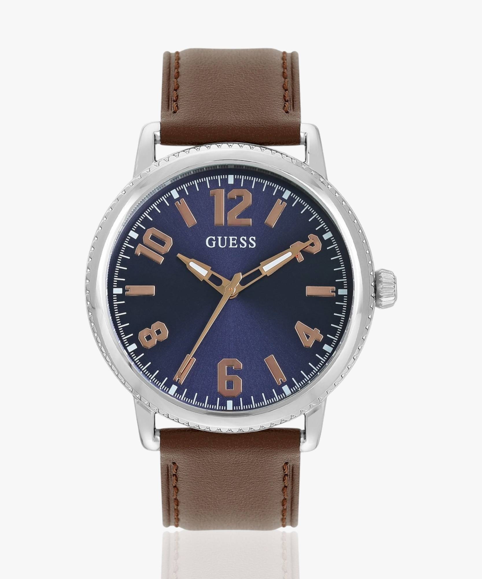 Guess Dress Standard Men 42mm Round Silver Tone Stainless Steel case with sunray Blue dial and Brown Genuine Leather Strap.