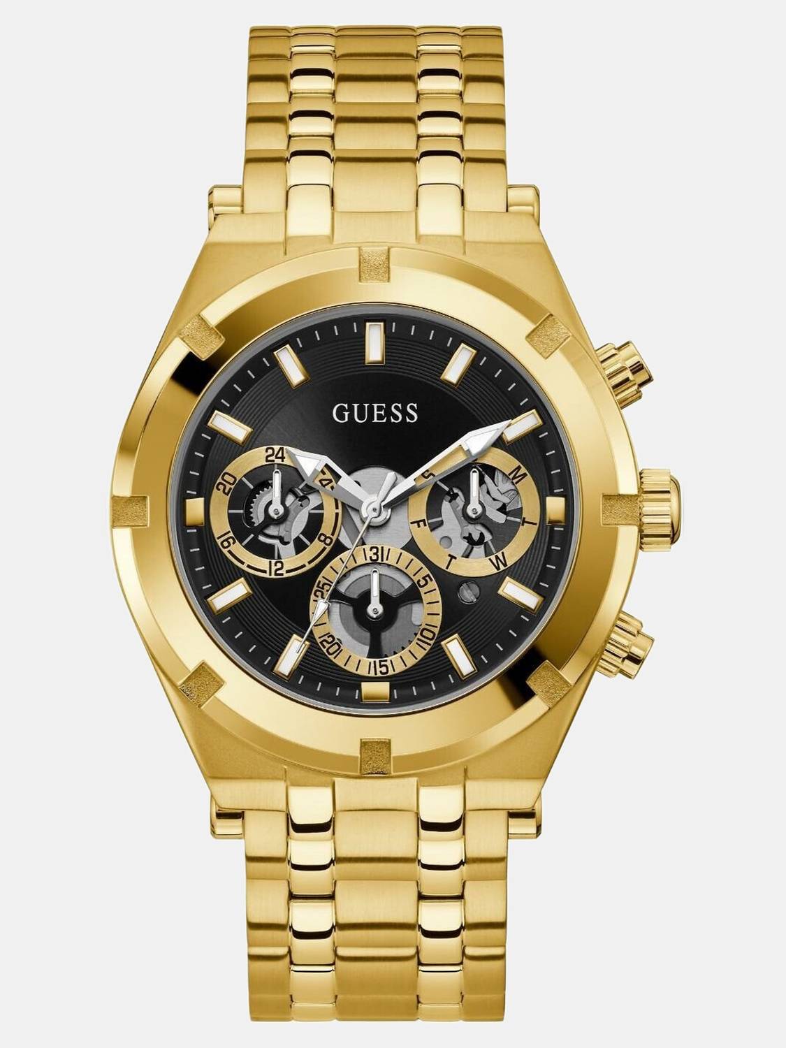 Introducing the Guess Continental Men's Sport Watch. Its dependable Quartz movement provides accuracy, while the tough stainless steel band and mineral glass offer comfort and scratch resistance. With a water resistance of 50M, you may wear it casually without hesitation. It comes with a one-year warranty. To keep it looking its best, use a cotton cloth to clean the dial.