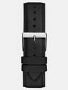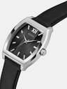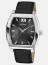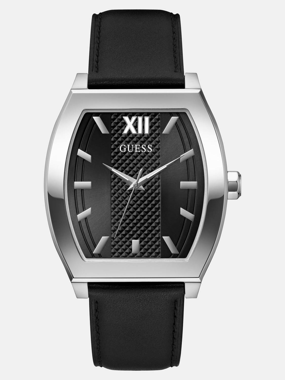Guess Dress Punctual Men 42mm Tonneau Silver Tone Recycled Steel case with Black dial and Black Genuine Leather Strap.