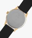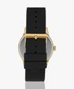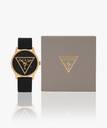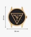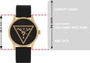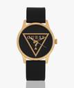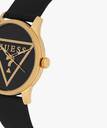 Guess Trend Tri Craze Men 43mm Round Gold Tone Recycled Steel case with sunaray Black logo dial and Black Silicone Strap.