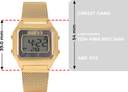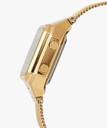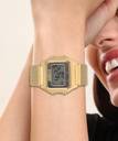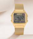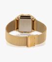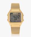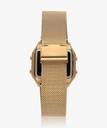 A digital watch that has a beautiful touch of mother of pearl black on the dial and pairs effortlessly with a self-adjustable gold mesh bracelet.
