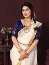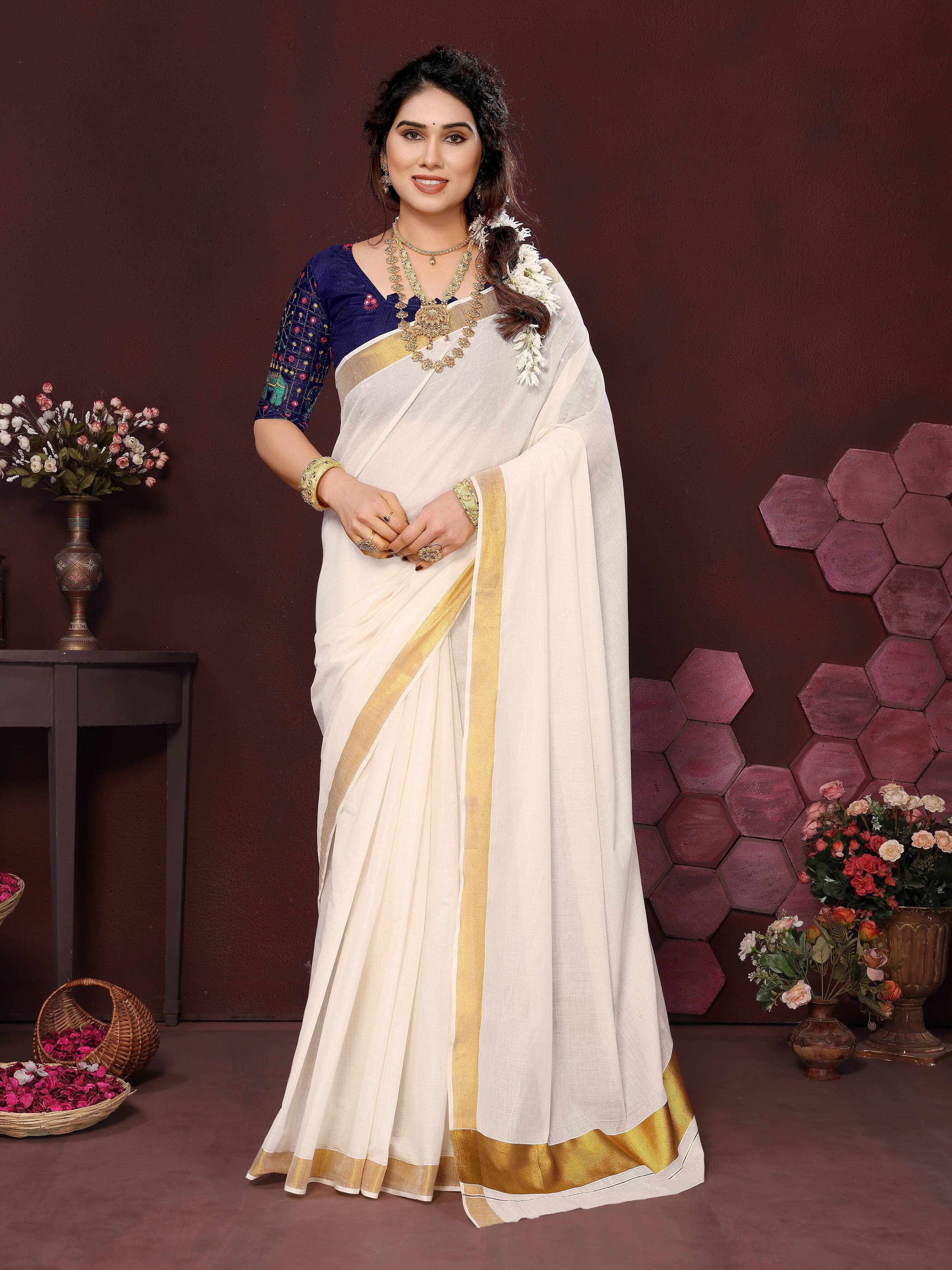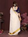 Original Kerala saree from Gugaliya, Includes 2 Unstiched blouse pieces: 1 attached & 1 designer embroidered, Promotes rural craftsmanship and heritage, Lightweight and comfortable fabric, Handwoven by traditional weavers, Suitable for festivals, weddings & special occasions