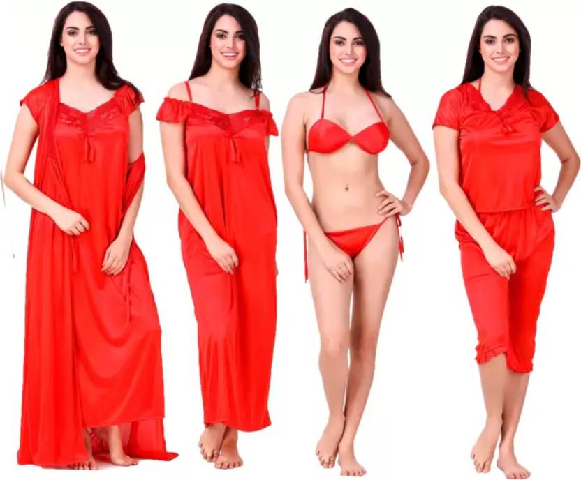 1 Full Nighty,, 1 Wrap gown,, 1 Top,, 1 Capri,, 1 Bra1, panty,, 1 Babydoll Nighty