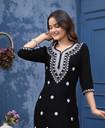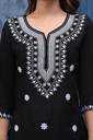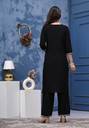 Designed with a notched neckline, the kurta in this ensemble presents a subtle opening that elegantly frames the collarbone. The classic three-quarter sleeves offer an ideal blend of coverage and comfort, making this outfit suitable for warm or transitional weather. Furthermore, the straight silhouette provides a structured drape, while the side slits allow for easy movement. When paired with the matching, comfort-fit trousers, this set creates a harmonious look that ensures comfort for extended wear.