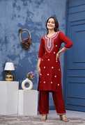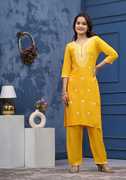 Showcasing a beautifully intricate embroidered pattern, this women's kurta and trousers set highlights excellent craftsmanship. The threadwork is delicately woven into the fabric to form well-placed motifs and borders on both garments, enhancing the overall aesthetic without overpowering this outfit. Additionally, the detailed embroidery on the yoke adds depth and sophistication to the kurta, embodying traditional artistry.