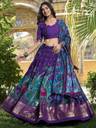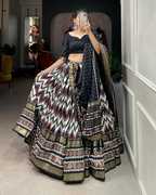 Get ready for Navratri with our stunning black color tussar silk navratri lehenga choli. Made from high-quality tussar silk material, it has leheriya with foil work and adds a touch of elegance. It comes with blouse material which is similar to the shade of the lehenga and also comes with tussar silk and gota patti lace border dupatta. Lehenga is semi-stitched and also with canvas. It can be customize up to 42 inch You can also pair it with a pair of earrings and bangles when adorning this outfit for an occasion.