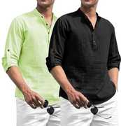 Men Solid Cotton Blend Straight Kurta (Light Green, Black)
