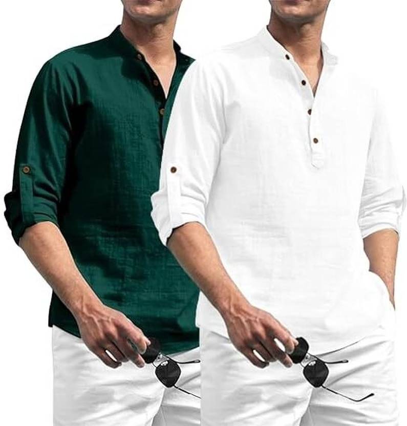 Men Solid Cotton Blend Straight Kurta (Green, White)