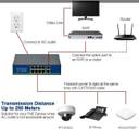 This PoE Switch include 8 PoE Ports and 2 Ethernet Uplink Ports at 10/100Mbps each. All ports of this poe switch supported by MDI/MDIX auto flip and self negotiation transmit power and data to IP Cameras, IP Phone, Wireless Access Point or other POE devices. 250 meters transmission distance. Totally quite no excessive heat, steady no delay.