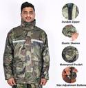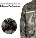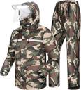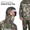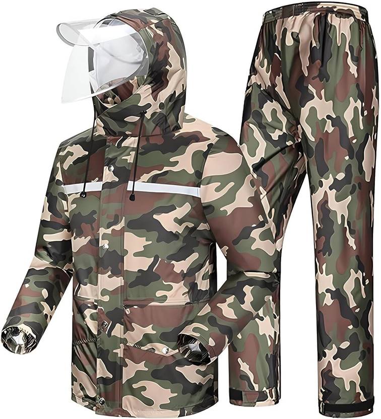 The polyester fabric is not only weather-resistant but also comfortable and soft. In adverse weather, it provides comfort and is safe for the body. It is practical because it has front pockets that are water-resistant. Additionally, this army print coat adds style and has an exquisite appearance. Furthermore, optimal airflow is made possible by the mesh lining in the chosen interior sections. Innovative translucent face brim that keeps the field of vision clear while protecting the eyes. A storage pouch is included with the two-piece rain suit. You can easily put it into the pouch and carry it anywhere.