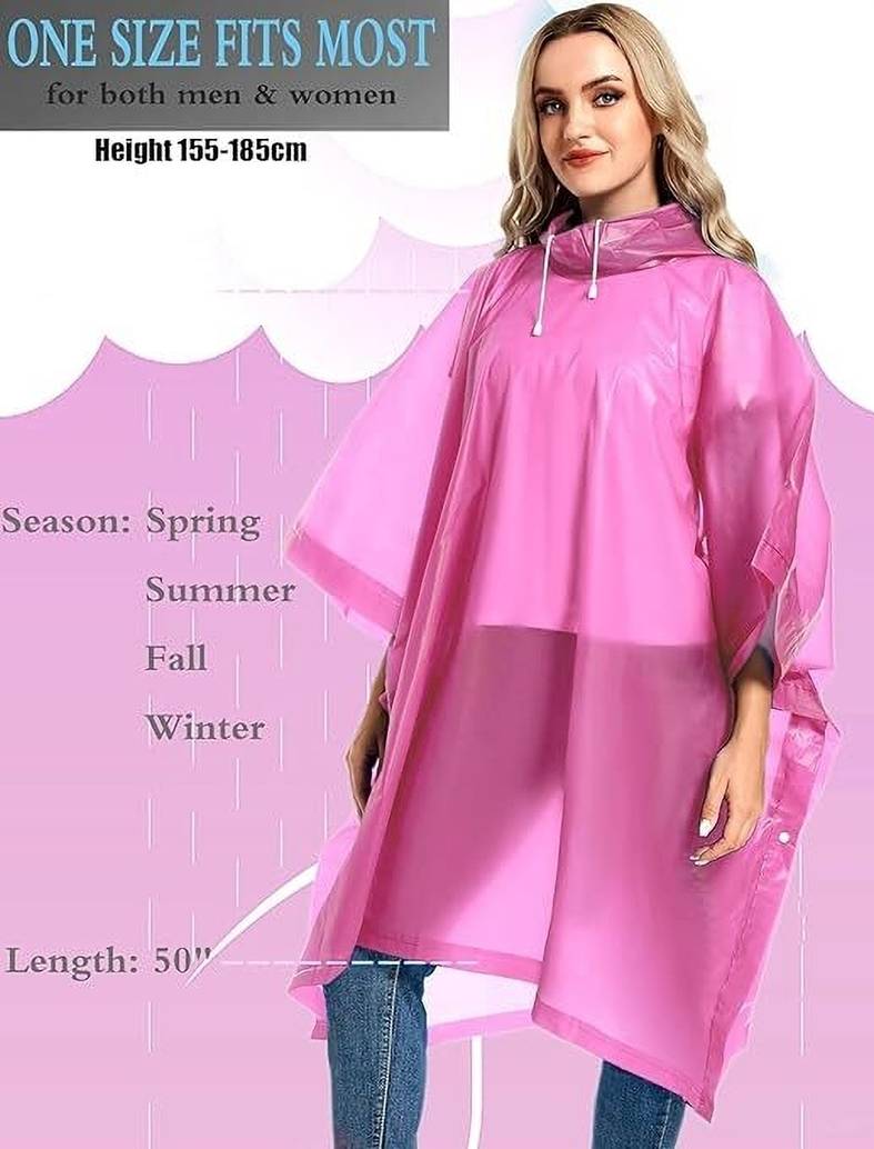 ONE SIZE FITS ALL: With a generous height range of 155-185cm, this raincoat accommodates both women and men, ensuring a comfortable fit for a wide range of users. No need to worry about sizing; it's a one-size-fits-all solution., TRANSPARENT & STYLISH: The transparent design not only keeps you dry but also allows your outfit to shine through. It's a fashionable choice for rainy days, and the stylish hue adds a touch of flair to your rainy season wardrobe., WATER-RESISTANT DESIGN: Stay dry and protected from head to toe. The integrated hood and sleeves ensure that every part of your body is shielded from the rain. The water-resistant EVA material repels moisture effectively.