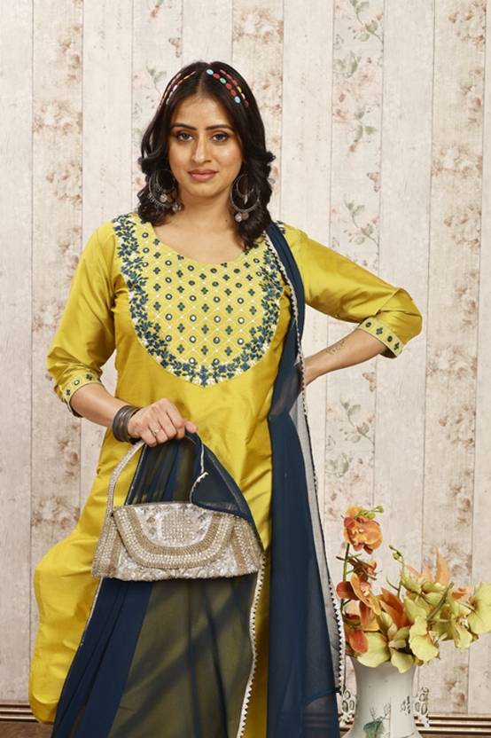This kurti set is crafted from art silk for the top fabric, creating a soft and smooth feel against the skin. The silk bottom fabric enhances the overall richness, making it visually appealing and comfortable. The combination of these materials ensures durability while offering a lightweight, flowy sensation, ideal for various climates. This choice of fabric ensures a graceful finish.