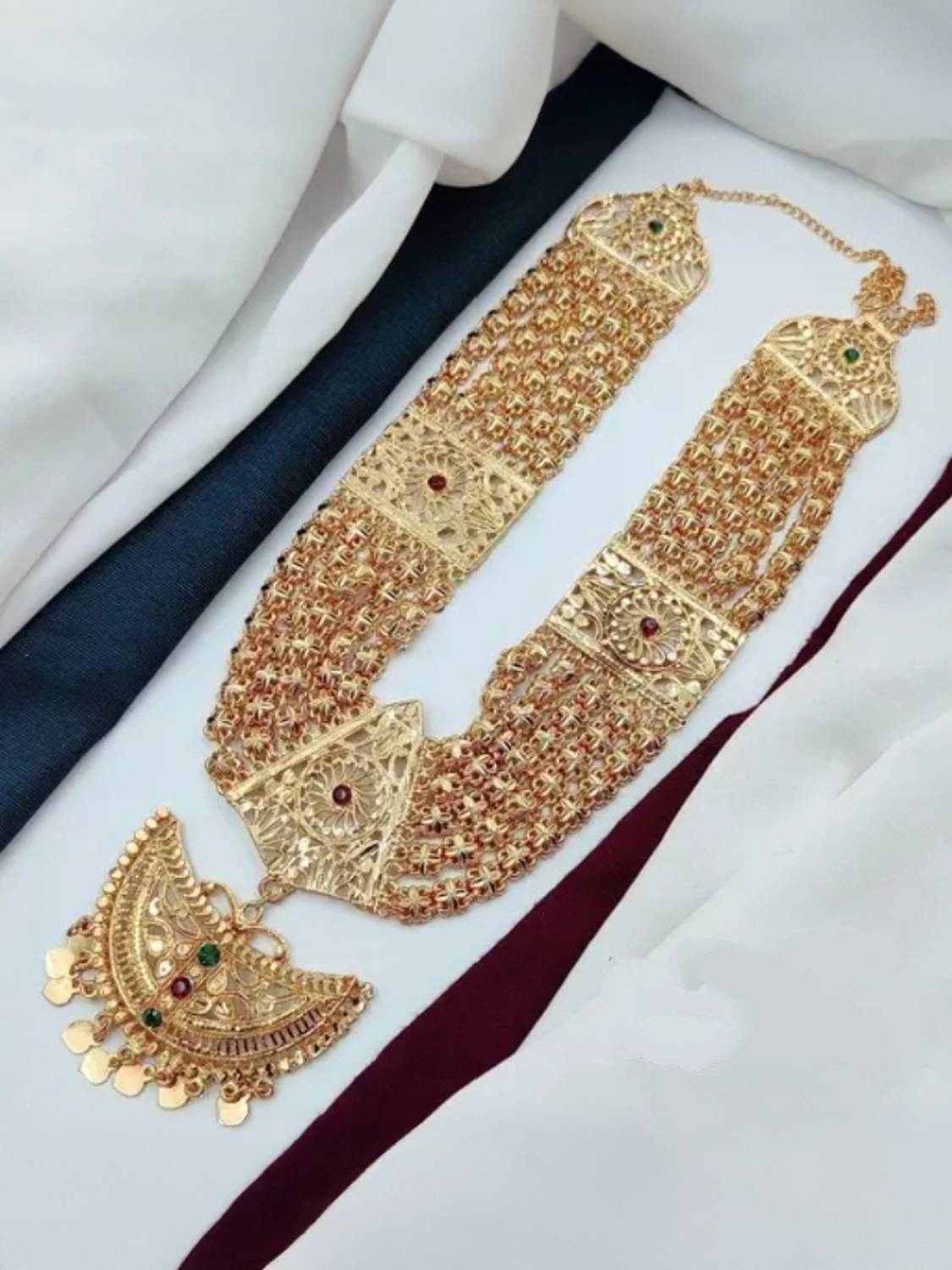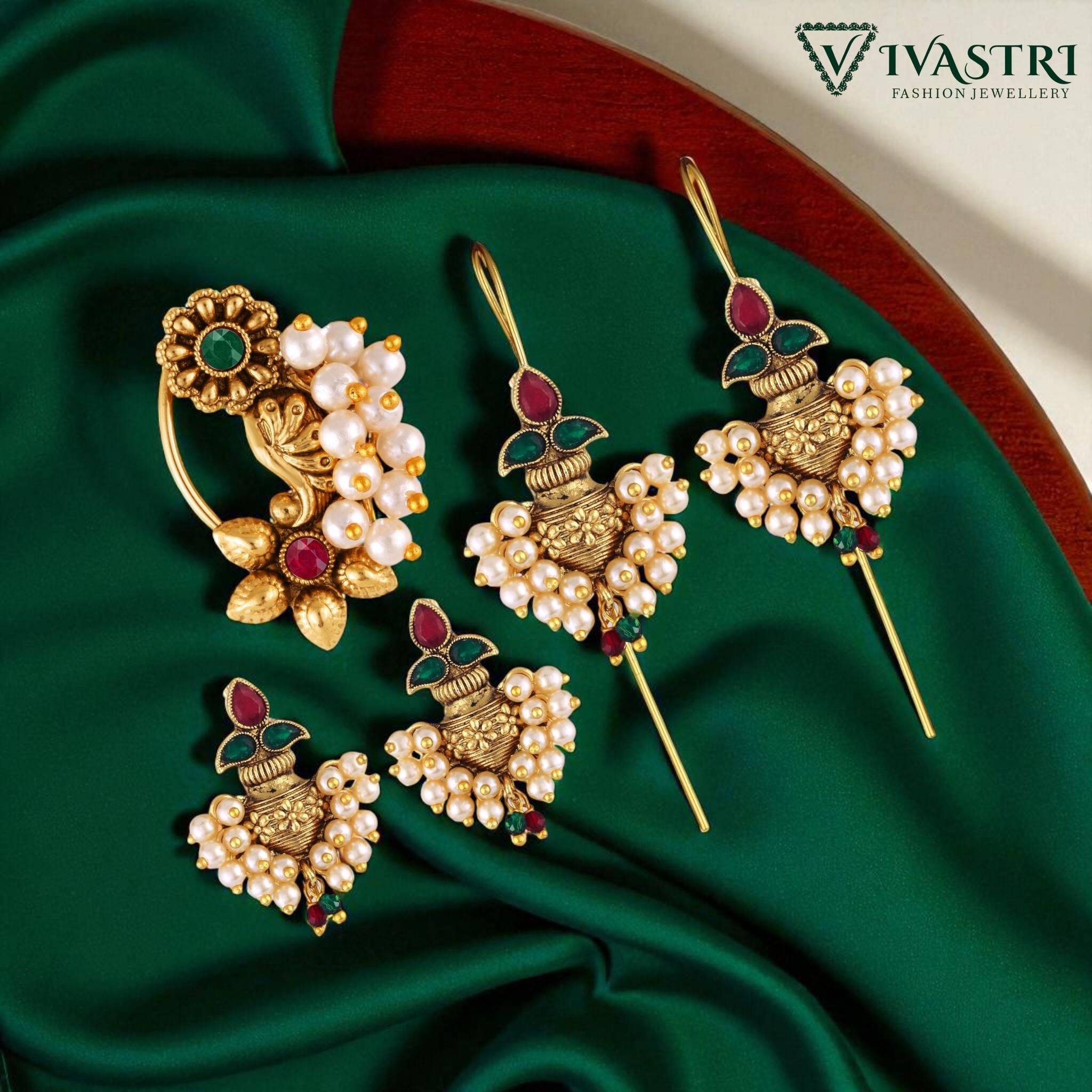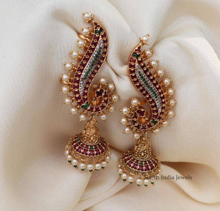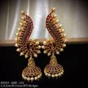 Add timeless elegance to your ethnic look with these exquisite South Indian style ear cuff jhumka earrings. Crafted with a rich gold-tone finish, these statement earrings feature a graceful peacock-inspired curved ear cuff design adorned with classic red Kemp stones, green accents, and fine pearl detailing. The beautifully carved jhumka drop is finished with layers of hanging pearls, creating a royal and festive appeal.