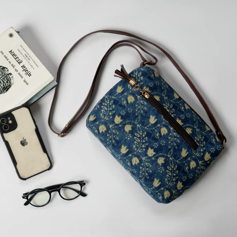 Elevate your style and convenience with our Navy Blue Premium Printed Cotton Fabric with Vegan Leather Sling Bag Cross Body—a perfect blend of function and fashion for your active lifestyle. Expertly crafted, this bag features a spacious main compartment for your diary, notepad, and documents. It includes an adjustable shoulder strap for carrying comfort, and can be worn as either a sling bag or crossbody bag. Ideal for work, errands, or city outings, it offers a secure back zipper pocket for your phone, wallet, makeup accessories, and keys. The lightweight, compact design allows for easy movement throughout your day, while the hand-crafted cotton fabric ensures durability and timeless style. Perfect as a gift or for daily use, this versatile bag suits college students, parties, and casual outings. Upgrade your accessory game with our Sling Bag Cross Body and enjoy a stylish, functional, and high-quality companion. Order now to experience it for yourself.