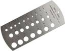 Stainless steel drill gauge with metric Ø1-13mm permanently etched graduations. Features a hanging hole for easy convenient storage.