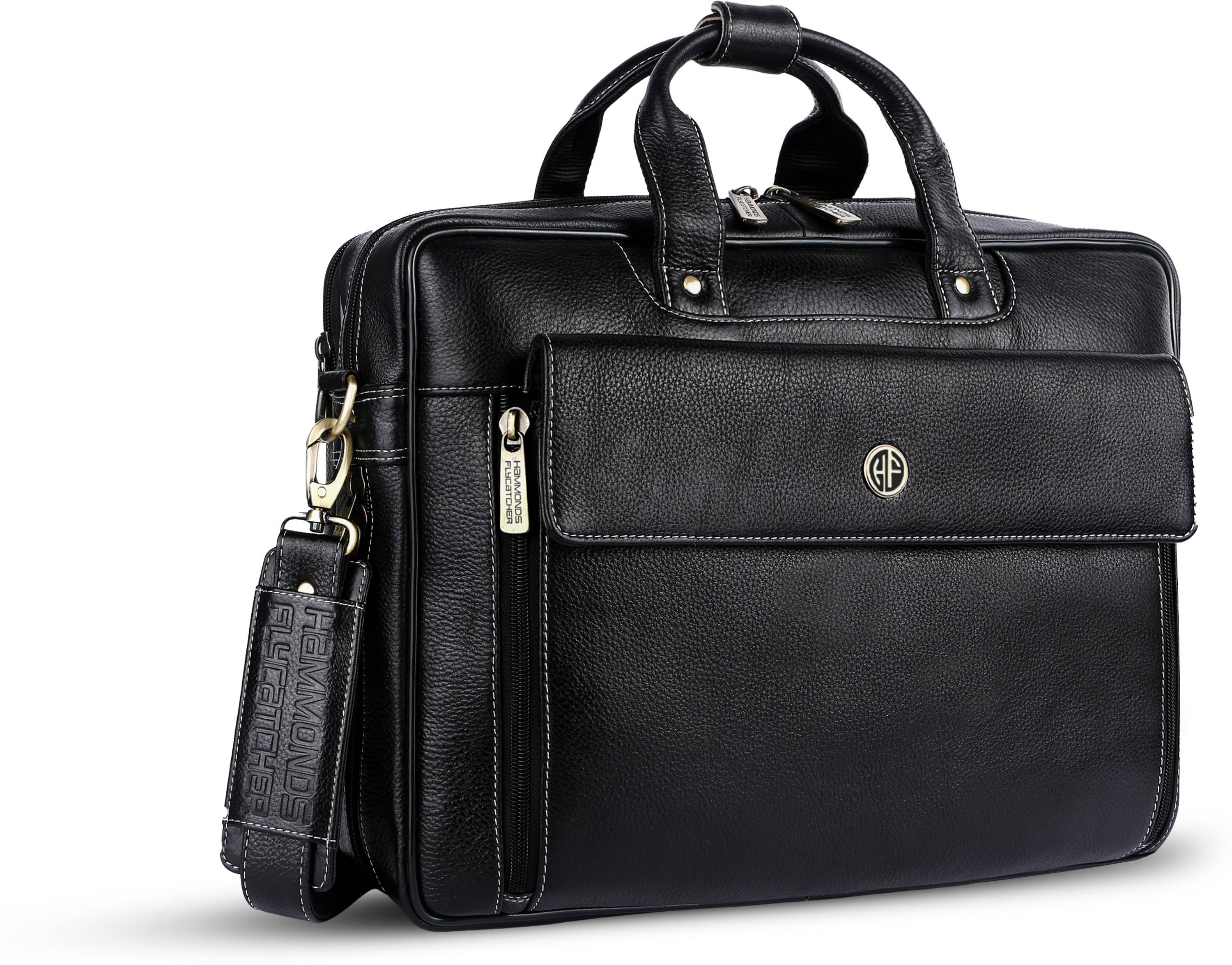 Elevate your professional style with the HAMMONDS FLYCATCHER Men Laptop Bags for Office, crafted from premium genuine leather. Designed for discerning individuals, this executive briefcase seamlessly blends functionality with elegance. With dimensions perfectly tailored (41cm x 11cm x 30cm) to accommodate up to a 15.6-inch laptop, this leather bag offers spacious compartments including a padded laptop sleeve, multiple interior pockets for organization, and a sleek exterior featuring a trolley strap for convenient travel. Experience unparalleled comfort with its padded removable shoulder strap and adjustable handles, ensuring effortless carrying whether you're commuting or traveling. The expandable design allows for additional storage space when needed, making it versatile for everyday use or business trips. Built to last, this official bag for men is not only stylish but also water-resistant, providing added protection for your essentials. Complete with Hammonds Flycatcher brand's signature zippers and sliders, stitched with high-quality nylon threads by professional designers, it exudes durability and refinement. Ideal for professionals seeking a sophisticated leather laptop bag that meets their daily business needs, the HAMMONDS FLYCATCHER Men's Leather Office Laptop Bag or men messenger bag also serves as a doctor bag for clinic visits or a laptop bag for office use. It doubles as mens laptop bag for office environments and office messenger bag for men, ensuring you stay organized and stylish throughout the day.