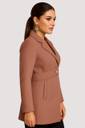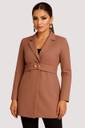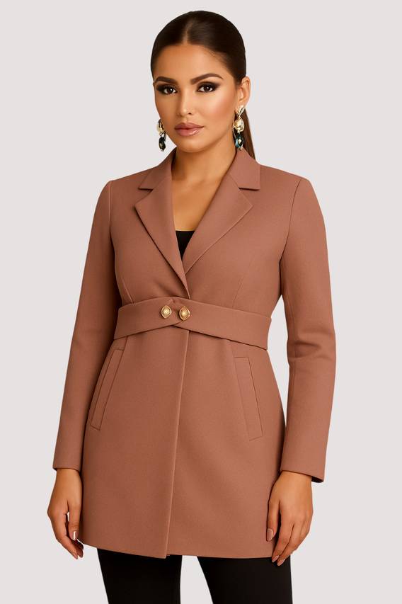 Elevate your wardrobe with this elegant longline blazer designed for a chic and polished look. Featuring a classic notch lapel collar, long sleeves, and a tailored silhouette, this blazer is perfect for both formal and semi-formal occasions. The design includes a sleek waist belt detail with dual gold-tone buttons, enhancing the structured fit and adding a touch of sophistication. Crafted from premium-quality Tweed fabric, it ensures comfort and durability while keeping you stylish throughout the day. The functional side pockets add practicality, making it a versatile piece for office wear, meetings, or evening outings. Pair it effortlessly with trousers, skirts, or dresses for a refined ensemble.