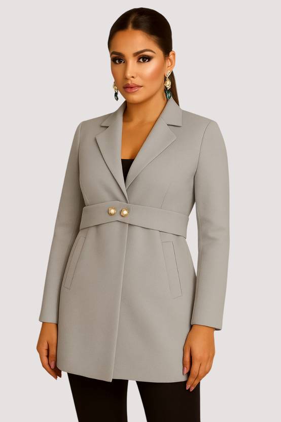 Elevate your wardrobe with this elegant longline blazer designed for a chic and polished look. Featuring a classic notch lapel collar, long sleeves, and a tailored silhouette, this blazer is perfect for both formal and semi-formal occasions. The design includes a sleek waist belt detail with dual gold-tone buttons, enhancing the structured fit and adding a touch of sophistication.